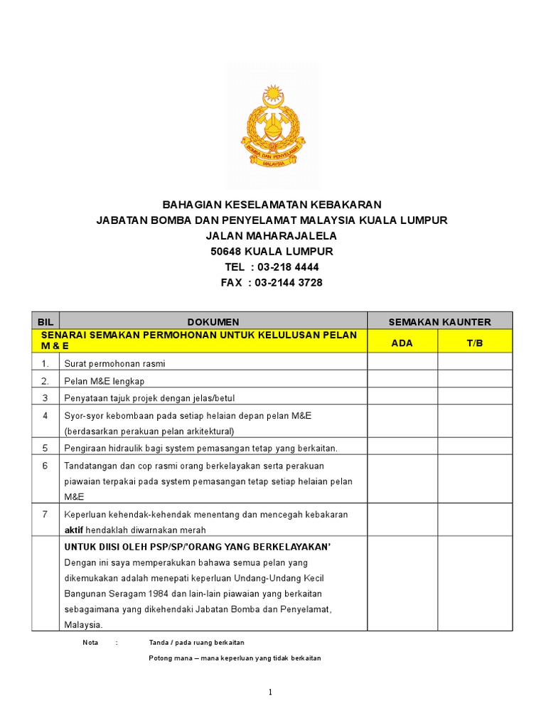 Kategori pemprosesan dikuatkuasa melalui Perintah Tetap Pencegah Dan Keselamatan Kebakaran Bilangan 1 Tahun 2007. SENARAI SEMAK PERMOHONAN UNTUK JABATAN BOMBA DAN PENYELAMAT MALAYSIA BIL DOKUMEN BILANGAN SET SEMAKAN KAUNTER SENARAI SEMAK PERMOHONAN UNTUK KELULUSAN PELAN ARKITEKTURAL 1 Surat permohonan rasmi dalam Bahasa Malaysia 2 Pelan arkitekural lengkap 3 Penyataan tajuk projek dengan jelas betul. Pelan bangunan satu 1 set kertas yang lengkap diwarnakan dalam saiz A1.
