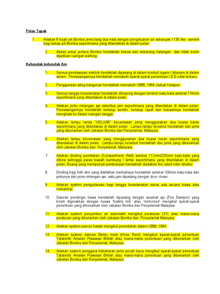 Sila pastikan juga jalan akses perkakas bomba access road dengan kelebaran tidak kurang 6 meter yang boleh menanggung beban 25 tan sepertimana yang ditandakan didalam pelan dan tulisan perkataan berwarna kuning LALUAN JENTERA BOMBA. Mari bercakap secara terperinci. Alat-Alat Pemadam Api 07.