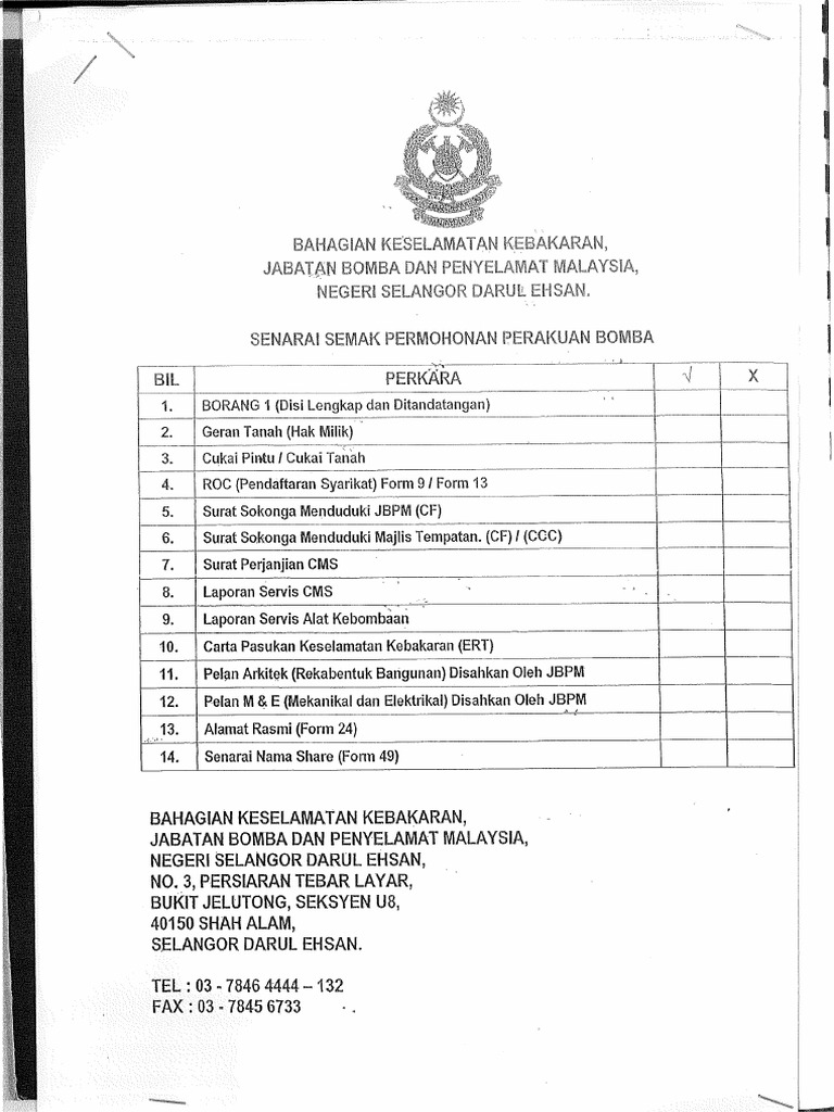 Paparan terbaik menggunakan Internet Explorer 90 dan ke atas atau Mozila Firefox dengan resolusi melebihi 1024 x 768 pixels. BORANG SENARAI SEMAK PERMOHONAN PEMERIKSAAN KESELAMATAN KEBAKARAN. SENARAI SEMAK KEPERLUAN MENGEMUKAKAN PELAN BANGUNAN DARI JABATAN BOMBA DAN PENYELAMAT SENARAI SEMAK KEPERLUAN MENGEMUKAN PELAN BANGUNAN BIL.