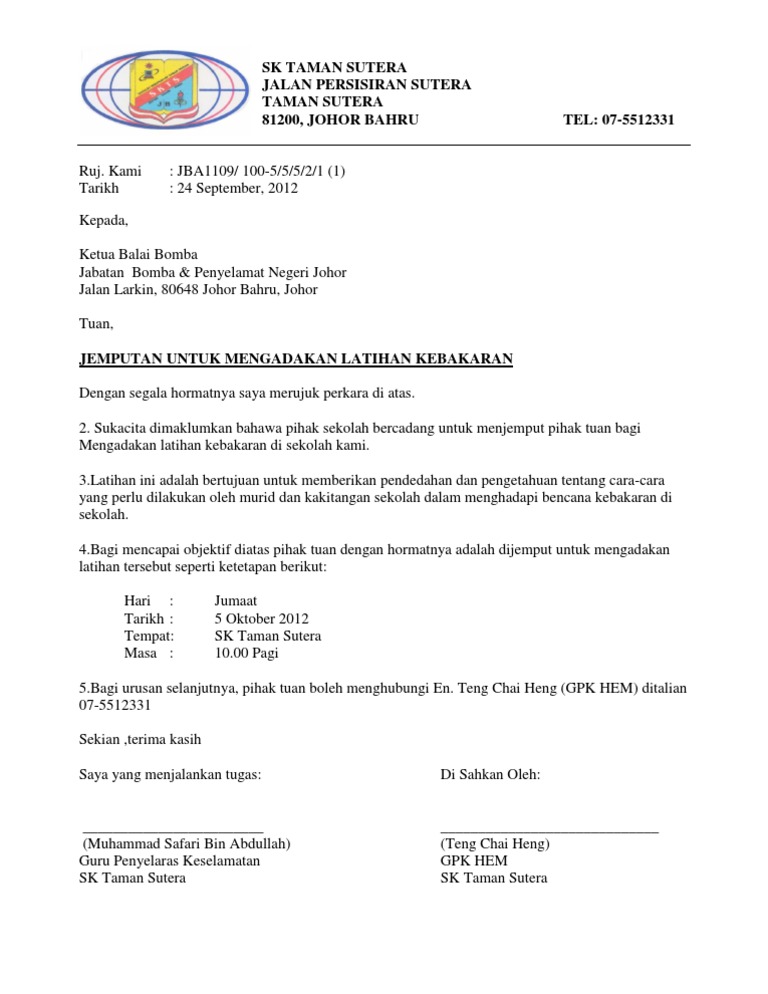 Sebuah Portal rujukan untuk warganetAnda cari soalan kami ada jawapannyaSegala rujukan berasaskan sumber rasmi dan betul-betul sahih sahajaJangan lupa LIKE dan FOLLOW kami di Facebook dan Twitter. Contoh Surat Permohonan Latihan Kebakaran Contoh surat rasmi permohonan latihan kebakaran bomba contoh surat rasmi permohonan latihan kebakaran sekolah contoh surat rasmi permohona. Portal Rasmi Jabatan Bomba Dan Penyelamat Malaysia Negeri via wwwbombagovmy.