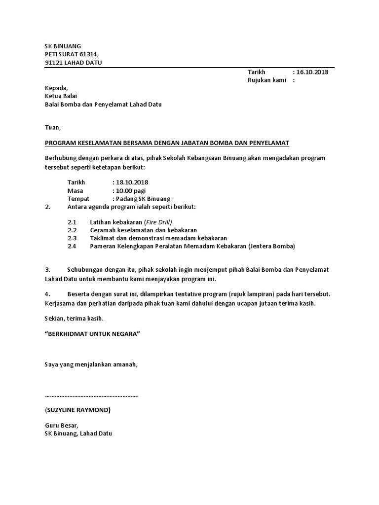 SWCorp Pelaksanaan kerja penyemburan Penyediaan logistik bahan nyah kuman Latihan kepada petugas Penyediaan laporan harian 4. Gambar Contoh Surat Rasmi Kepada Jabatan Bomba Terlengkap 2019. Surat jemputan ceramah keselamatan kepada bomba.