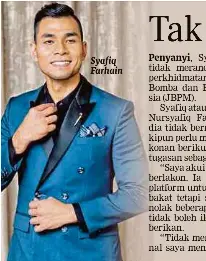 PENYANYI Syafiq Farhain berkata tiada masalah untuk dia meneruskan karier nyanyian meskipun terikat dengan kerjaya tetap sebagai seorang anggota bomba. Selepas menjalani tempoh kuarantin selama dua minggu akhirnya penyanyi Syafiq Farhain menarik nafas lega apabila dia kini bebas COVID-19. Malah penyanyi lagu Sayang Maafkan Aku itu sudah kembali menjalankan tugas sebagai anggota bomba sejak kelmarin.
