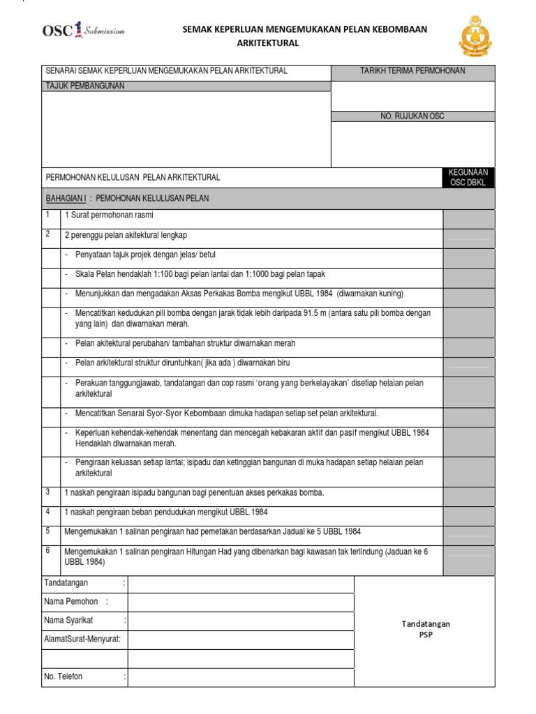 Pejabat Zon Petaling Balai Bomba dan Penyelamat Puchong Jalan Bandar 2 Pusat Bandar Puchong 47100 Puchong Selangor DE SENARAI SEMAKAN PERMOHONAN UNTUK JABATAN BOMBA DAN PENYELAMAT MALAYSIA BIL DOKUMEN BILANGAN SEMAKAN SET KAUNTER SENARAI SEMAKAN PERMOHONAN UNTUK KELULUSAN PELAN ARKITEKTURAL 1 Surat. Kategori pemprosesan dikuatkuasa melalui Perintah Tetap Pencegah Dan Keselamatan Kebakaran Bilangan 1 Tahun 2007. Senarai Semak Kehendak-Kehendak Kebombaan.